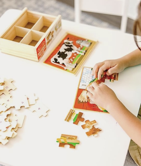 Puzzles are a cornerstone of Montessori learning, enhancing problem-solving and cognitive development. Start with simpler 12-piece puzzles, and gradually increase the complexity to challenge your child’s growing skills. Puzzles like those from Melissa and Doug are excellent, as they captivate children’s attention and encourage revisiting and mastering the task. Puzzles that have knobs attached for manipulating the pieces will foster the proper pincer grip and hand strength.