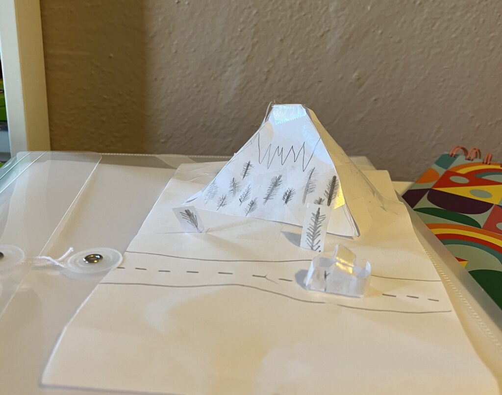 One of my favorite moments was when, on one of our many drives through the mountains to Grandma’s house in Southern Oregon, my daughter secretly created an intricate paper diorama of Mount Shasta, complete with tiny trees and a winding road. All she used was paper, tape, and a pencil.