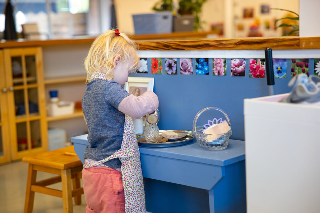 In a non-Montessori setting, you might see children sitting still and learning through repetition on paper. In Montessori, the learning happens through movement, discovery, and real-world tasks that connect children to the world around them.