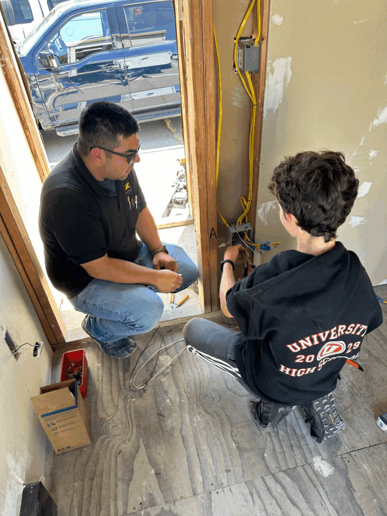 Lightning Electric donated their time to install the electrical circuit box and stayed around to give the students a lesson on wiring electrical outlets.