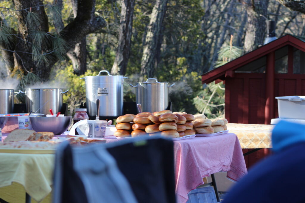 All the mornings were cold, especially the second day. We were allowed to come out of our tents at around 6:30, and when I woke up, there were already pots of water boiling for washing dishes, making breakfast, and serving hot chocolate. For breakfasts and dinners, two groups of people were assigned, one for cooking and one for cleaning, and by the time everyone was awake, the breakfast crew had already set up tables of food for breakfast and packing lunch. Even in the chilly weather, it was an amazing opportunity to strengthen bonds while spending the morning with friends over warm food and hot chocolate.